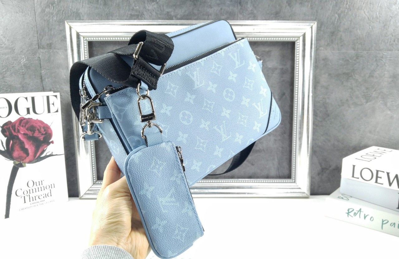 스카이 블루 모노그램 코팅 캔버스 및 타이가 카우하이드 가죽 카우하이드 가죽 소재의 트리밍 텍스타일 소재의 안감 실버 색상 하드웨어 탈착 가능한 앞면 지퍼형 포켓 메인 파우치에 달린 앞면 플랫 포켓 내부 플랫 포켓 스트랩 부분의 탈착형 코인 퍼스 스트랩:탈부착 가능, 길이 조절 가능