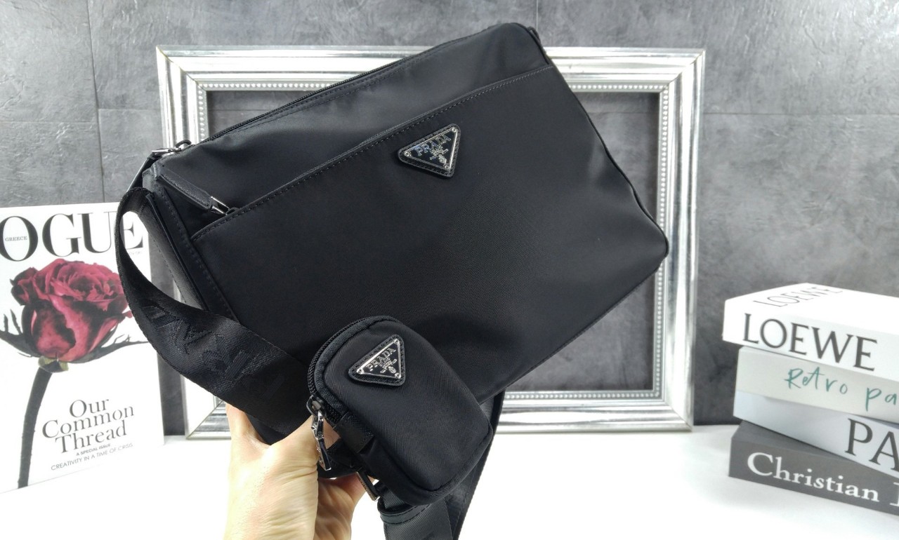 맞춤 조절형 우븐 나일론 테이프 및 가죽 솔더 스트랩 전면 에나멜 메탈 트라이앵글 로고 지퍼 클로저 외부 지퍼 포켓 1개 내부 지퍼 포켓 리나일론 로고프린트 라이닝 외부 미니포켓