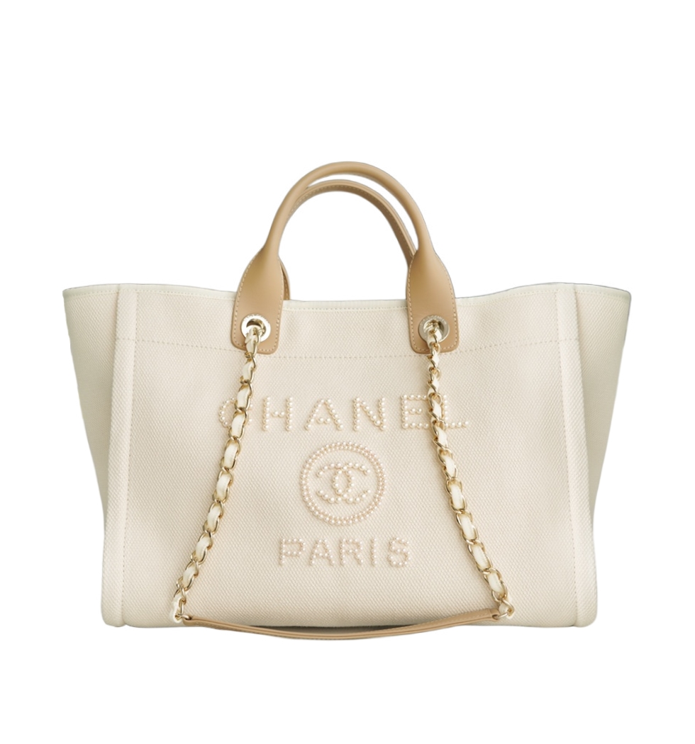[프리미엄/해외배송]샤넬 진주 로고 캔버스 토트백(내추럴/금장/캔버스)