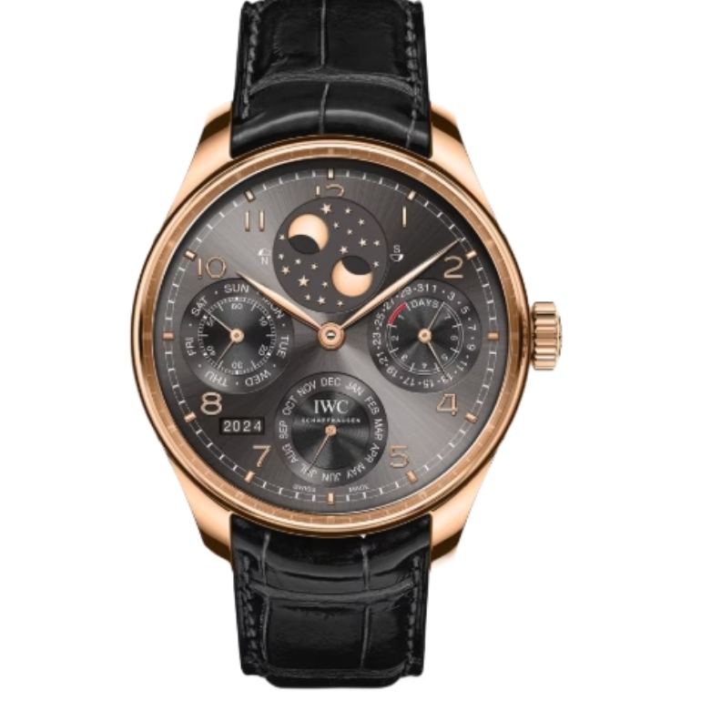 IWC 포르투기즈 Perpetual Calendar 44mm IW503404 Rose Gold Leather Strap Arabic Numerals Grey Dial[APS]