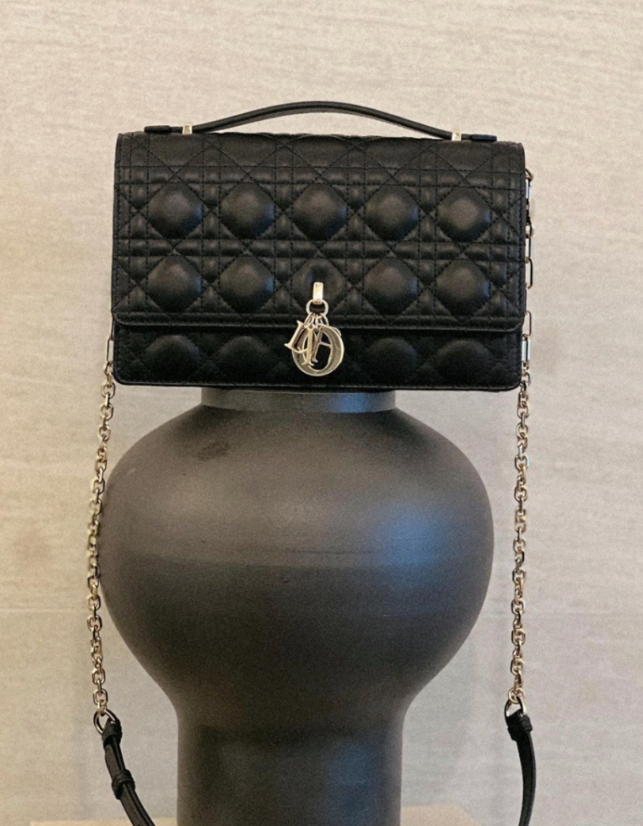 2024 크루즈 컬렉션에서 새롭게 선보이는 우아하고 실용적인 디자인의 Miss Dior 탑 핸들 백입니다. 블랙 컬러의 양가죽 소재에 까나쥬 스티칭을 더해 완성한 백으로 D.I.O.R. 참 디테일의 플랩이 돋보이며, 2개의 수납공간과 지퍼 파우치에 모든 데일리 소지품을 보관하여 데이 룩 또는 이브닝 룩으로 활용할 수 있습니다. 가죽 인서트와 탈착식 체인 스트랩으로 완성된 시그니처 상단 핸들이 있어 핸드백, 숄더백, 크로스백으로 편안하게 연출할 수 있습니다.