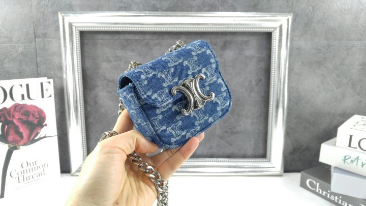 미니 체인 클로드 – 트리옹프 올 오버 데님 DENIM / SILVER 텍스타일 안감: 램스킨 실버 피니시 크로스바디백 및 숄더백으로 착용 가능 트리옹프 메탈릭 스냅 버튼 잠금장치 내부 플랫 포켓 1개