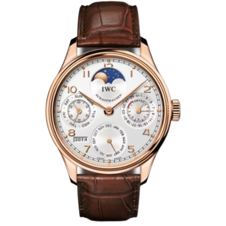 IWC 포르투기즈 Perpetual Calendar 44mm IW502302 Rose Gold Leather Strap Arabic Numerals Silver Dial[APS]